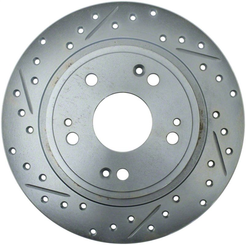 StopTech Drilled and Slotted Sport Rotors are 1-piece direct replacement brake discs for factory brake systems and stock calipers that look great behind your wheels and offer significantly improved braking performance. The unique cross-drilling and slotting aids with heat and brake dust dispersal; prevents glazing of the pads; adds bite and improves wet and dry braking performance. Built to last; the black e-coating provides protection from corrosion and the high carbon metallurgy (in most applications) offers quieter operation; better crack resistance and increased performance.