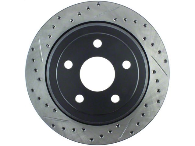 StopTech Drilled and Slotted Sport Rotors are 1-piece direct replacement brake discs for factory brake systems and stock calipers that look great behind your wheels and offer significantly improved braking performance. The unique cross-drilling and slotting aids with heat and brake dust dispersal; prevents glazing of the pads; adds bite and improves wet and dry braking performance. Built to last; the black e-coating provides protection from corrosion and the high carbon metallurgy (in most applications) offers quieter operation; better crack resistance and increased performance.