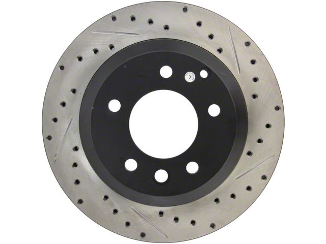 StopTech Drilled and Slotted Sport Rotors are 1-piece direct replacement brake discs for factory brake systems and stock calipers that look great behind your wheels and offer significantly improved braking performance. The unique cross-drilling and slotting aids with heat and brake dust dispersal; prevents glazing of the pads; adds bite and improves wet and dry braking performance. Built to last; the black e-coating provides protection from corrosion and the high carbon metallurgy (in most applications) offers quieter operation; better crack resistance and increased performance.