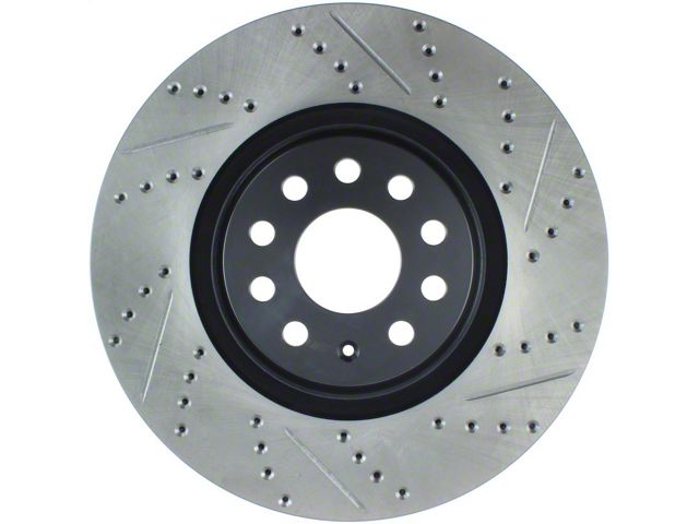 StopTech Drilled and Slotted Sport Rotors are 1-piece direct replacement brake discs for factory brake systems and stock calipers that look great behind your wheels and offer significantly improved braking performance. The unique cross-drilling and slotting aids with heat and brake dust dispersal; prevents glazing of the pads; adds bite and improves wet and dry braking performance. Built to last; the black e-coating provides protection from corrosion and the high carbon metallurgy (in most applications) offers quieter operation; better crack resistance and increased performance.