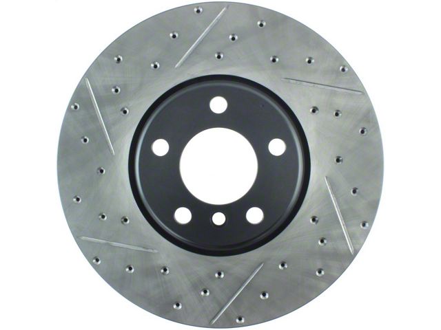 StopTech Drilled and Slotted Sport Rotors are 1-piece direct replacement brake discs for factory brake systems and stock calipers that look great behind your wheels and offer significantly improved braking performance. The unique cross-drilling and slotting aids with heat and brake dust dispersal, prevents glazing of the pads, adds bite and improves wet and dry braking performance. Built to last, the black e-coating provides protection from corrosion and the high carbon metallurgy (in most applications) offers quieter operation, better crack resistance and increased performance.