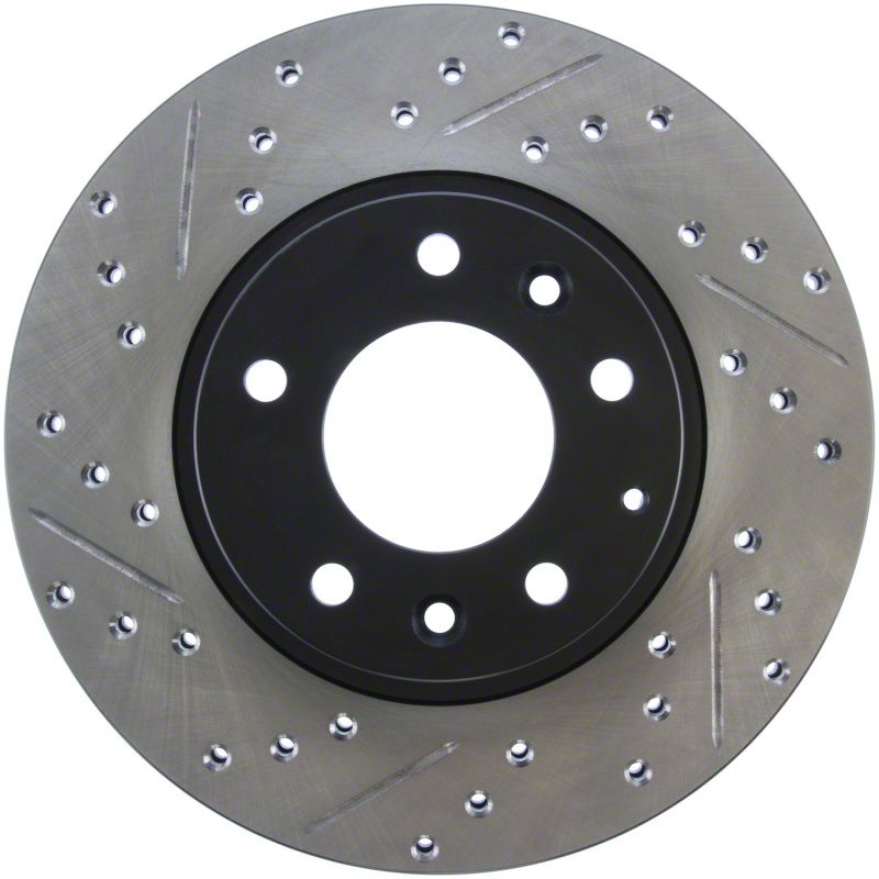 StopTech Drilled and Slotted Sport Rotors are 1-piece direct replacement brake discs for factory brake systems and stock calipers that look great behind your wheels and offer significantly improved braking performance. The unique cross-drilling and slotting aids with heat and brake dust dispersal; prevents glazing of the pads; adds bite and improves wet and dry braking performance. Built to last; the black e-coating provides protection from corrosion and the high carbon metallurgy (in most applications) offers quieter operation; better crack resistance and increased performance.
