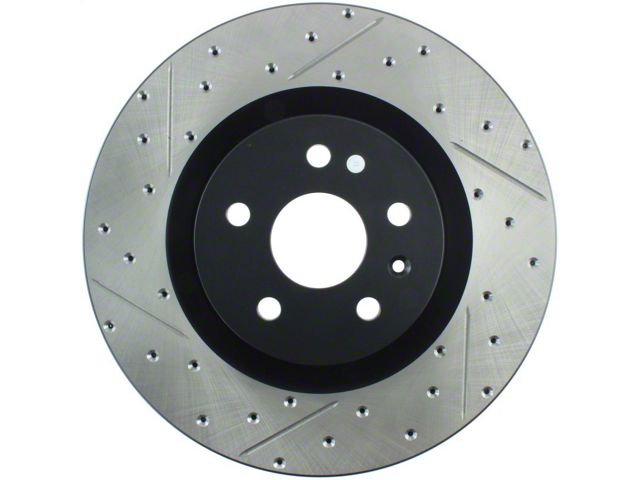 StopTech Drilled and Slotted Sport Rotors are 1-piece direct replacement brake discs for factory brake systems and stock calipers that look great behind your wheels and offer significantly improved braking performance. The unique cross-drilling and slotting aids with heat and brake dust dispersal; prevents glazing of the pads; adds bite and improves wet and dry braking performance. Built to last; the black e-coating provides protection from corrosion and the high carbon metallurgy (in most applications) offers quieter operation; better crack resistance and increased performance.