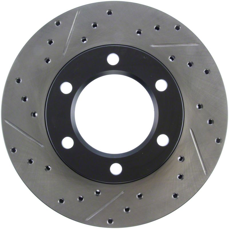 StopTech Drilled and Slotted Sport Rotors are 1-piece direct replacement brake discs for factory brake systems and stock calipers that look great behind your wheels and offer significantly improved braking performance. The unique cross-drilling and slotting aids with heat and brake dust dispersal, prevents glazing of the pads, adds bite and improves wet and dry braking performance. Built to last, the black e-coating provides protection from corrosion and the high carbon metallurgy (in most applications) offers quieter operation, better crack resistance and increased performance.