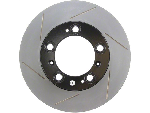 StopTech Slotted Sport Rotors are 1-piece direct replacement brake discs for factory brake systems and stock calipers that look great behind your wheels and offer significantly improved braking performance. The unique slotting aids with heat and brake dust dispersal, prevents glazing of the pads, adds bite and improves wet and dry braking performance. Built to last, the black e-coating provides protection from corrosion and the high carbon metallurgy (in most applications) offers quieter operation, better crack resistance and increased performance.