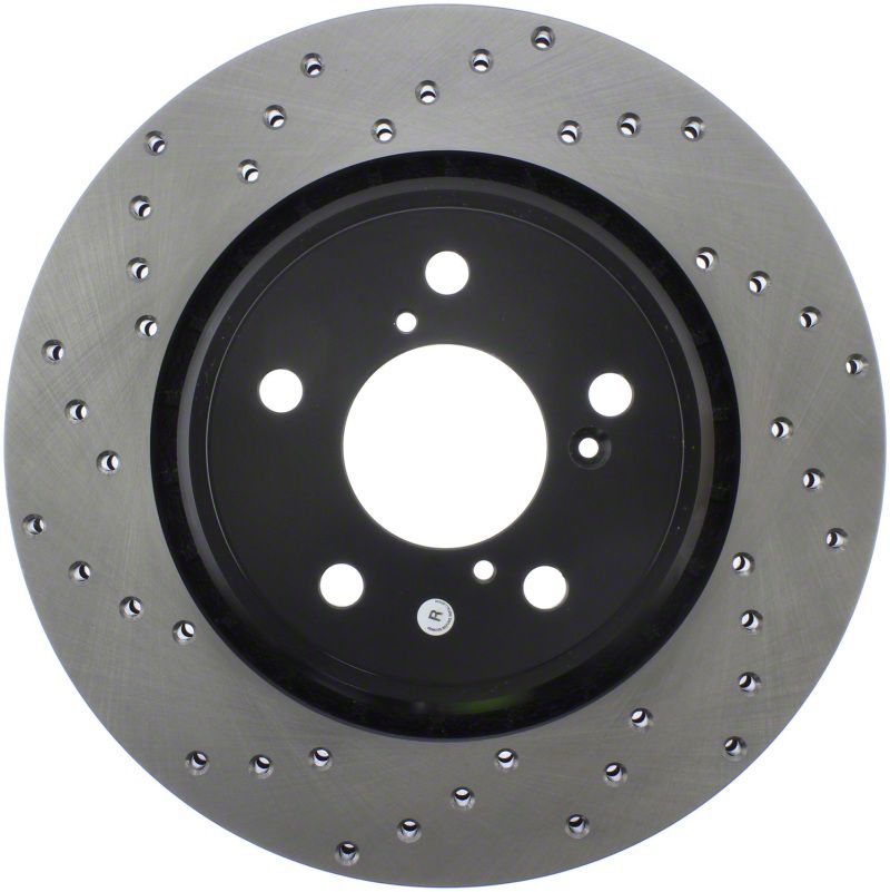 StopTech Drilled Sport Rotors are 1-piece direct replacement brake discs for factory brake systems and stock calipers that look great behind your wheels and offer significantly improved braking performance. The unique cross-drilling aids with heat and brake dust dispersal, prevents glazing of the pads, adds bite and improves wet and dry braking performance. Built to last, the black e-coating provides protection from corrosion and the high carbon metallurgy (in most applications) offers quieter operation, better crack resistance and increased performance.
