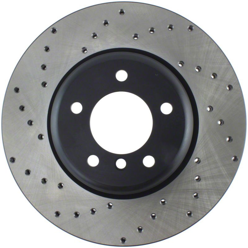 StopTech Drilled Sport Rotors are 1-piece direct replacement brake discs for factory brake systems and stock calipers that look great behind your wheels and offer significantly improved braking performance. The unique cross-drilling aids with heat and brake dust dispersal, prevents glazing of the pads, adds bite and improves wet and dry braking performance. Built to last, the black e-coating provides protection from corrosion and the high carbon metallurgy (in most applications) offers quieter operation, better crack resistance and increased performance.