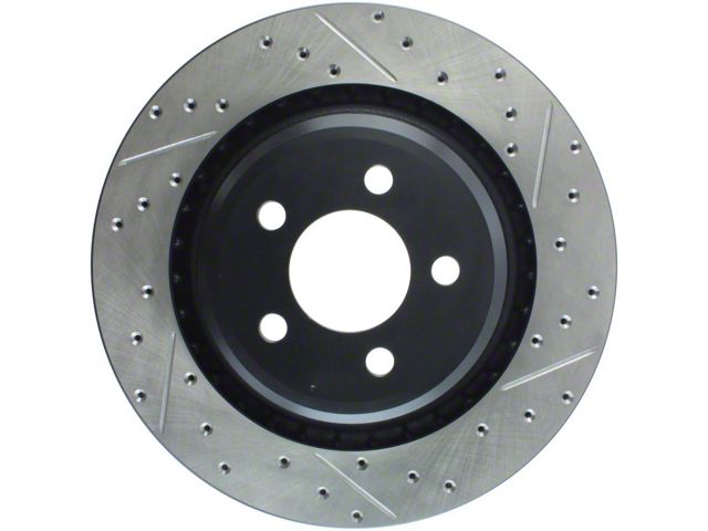 StopTech Drilled and Slotted Sport Rotors are 1-piece direct replacement brake discs for factory brake systems and stock calipers that look great behind your wheels and offer significantly improved braking performance. The unique cross-drilling and slotting aids with heat and brake dust dispersal; prevents glazing of the pads; adds bite and improves wet and dry braking performance. Built to last; the black e-coating provides protection from corrosion and the high carbon metallurgy (in most applications) offers quieter operation; better crack resistance and increased performance.