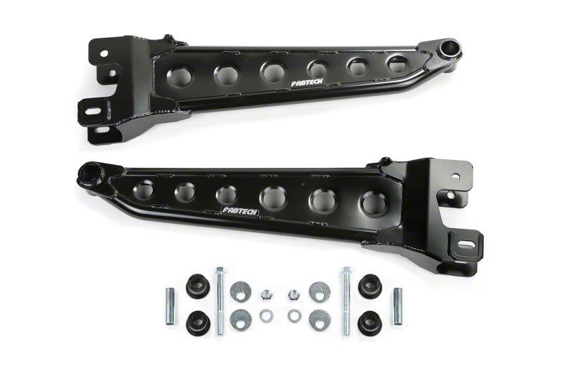 2005-20 Ford F250/F350 4WD. 2008-19 Ford F450/F550 4WD. Fabtech's legendary Radius Arms are the perfect upgrade to the Ford Super Duty front suspension for lifted applications. The heavy duty tubular construction adds strength with a race component style to the vehicle for aggressive offroad use. These Super Duty Radius Arms directly replace the factory arms for use with lifted 4in to 8in suspensions. The arms have an additional 1 degree of caster built into the arms and with the easy adjustment alignment cams gives a total of 2 degrees more caster than stock. A big benefit for taller 6in and 8in lifted vehicles to improve highway tracking. The upper and lower tubes of the arms are constructed with 1.75in OD x .120in wall DOM tubing and are fully welded closed to prevent corrosion. Spanning between the tubes is a dimple die side plate that adds rigidity to the arm for strength with minimal weight gain. Radius Arms are offset and positioned inboard compared to the stock arms to allow full steering lock with a 13.50 wide tire on a 5in backspace wheel. The Fabtech Super Duty Radius Arms are an open design so that powdercoat can cover the entire arm. This design is superior in coating coverage compared to boxed arms that are stitch welded and have gaps that allow moisture to get and cause rust. Fabtech's Radius Arms have been proven for over 15 years in consumer, commercial and military applications. There are no better Radius Arms for your Super Duty. Features: Constructed with 1.75in OD x .120in wall DOM tubing. Directly replace factory arms on lifted vehicles. Additional caster to improve tracking.