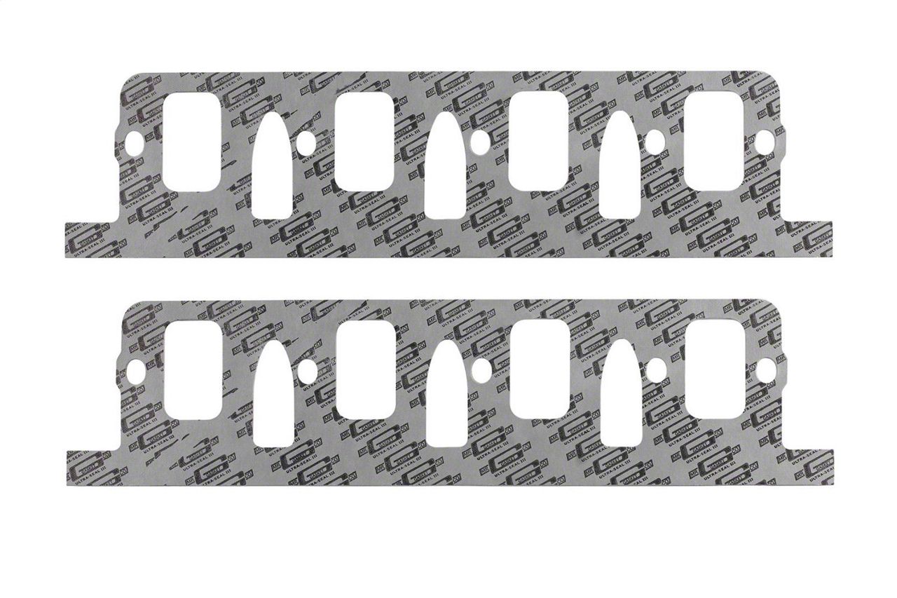 Mr. Gasket Super Ultra-Seal III Performance Intake Gaskets are made from a high-density material that combines a custom-engineered copolymer binder system which holds fibers and fillers together, reinforced with 100 percent synthetic fiber and high-temperature fillers, to produce a uniform, high-strength composite sealing material. This material delivers excellent sealing properties for oil, fuels and coolant at low flange pressure (clamp force), along with high crush resistance for continuous use to 350 degrees Fahrenheit and intermittent exposure to 650 degrees Fahrenheit. Made from high-density, high-tensile strength and high-temperature gasket material. Delivers excellent sealing properties for oil, fuel and coolant. Seals using low flange pressure (clamp force). Can be modified (trimmed) easily to fit custom applications. Requires no gasket sealer for installation. Releases easily (no scrapping required) will not stick to mating surfaces when disassembling engine.