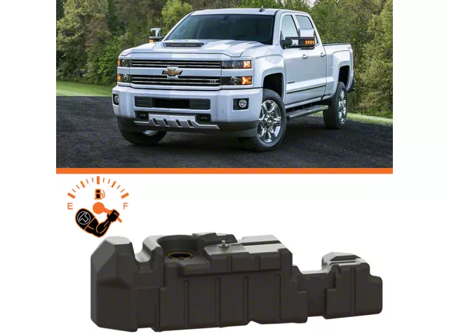 56 Gallon, extra capacity, extra heavy duty mid-ship, replacement fuel tank for 2017-2019 GM 2500HD and 3500HD pickups with Crew-Cabs, 6 ½ ft. beds and Duramax diesel engines.