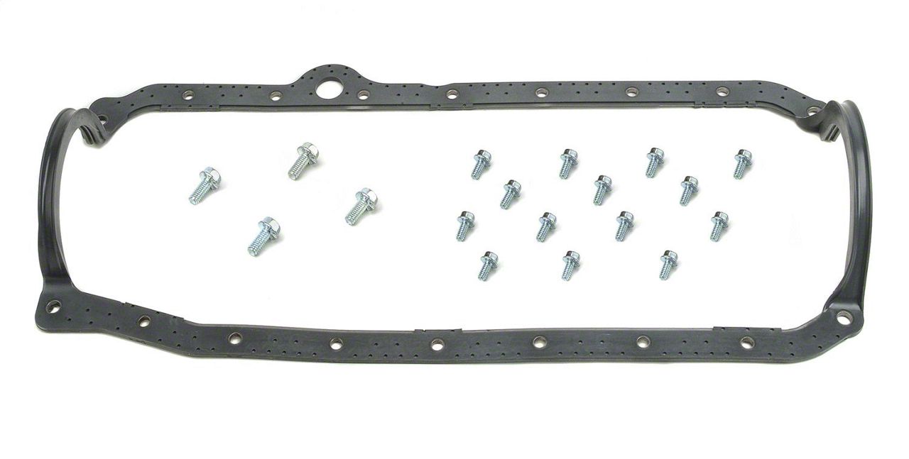 Thick, molded rubber with steel carrier. Manufactured from high-density cork and rubber blend gasket material. A black latex rubber coating is applied to outside of gasket to help seal minor flange irregularities and eliminate the possibility of oil leakage. Creates a positive seal by controlled swelling of the gasket material when exposed to hot engine oil. Available in standard or extra thick to provide additional valve train to cover clearance. For OE replacement, high performance street, drag race and oval track.