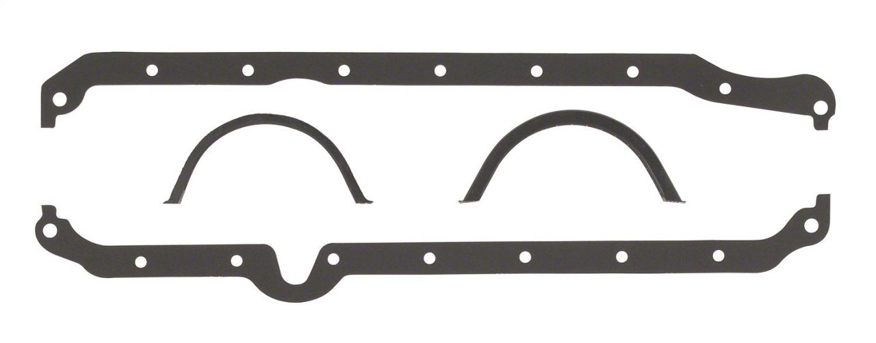 Manufactured from cellulose and nitrile composition gasket material. A black latex rubber coating is applied to outside of gasket to help seal minor oil pan rail irregularities and eliminate the possibility of oil leakage. Provides excellent sealing and durability. Complete with molded rubber front/rear oil pan seals where applicable. For OE replacement, high performance street, drag race and oval track.