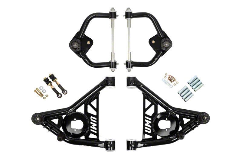 UMI's 2nd Generation F-Body a-arm kit, P/N 265253-1 is designed to make your classic cruiser feel like modern muscle. Increased positive caster combined with improved camber curve and low friction Delrin bushings make for a well-tuned front end. Increased caster is achieved relocating both the upper and lower ball joints to enhance steering feel and improve high speed stability. As designed, the caster range is 5-7 degrees. The spindle pin location remains unchanged so fender clearance is like stock. The upper a-arms include offset CrMo cross shafts to reduce the amount of shims required when setting camber as well as a tall ball joint to improve camber gain. Upper and lower a-arms are assembled with UMI built Delrin bushings to allow proper suspension movement. A pancake style polyurethane bump stop is included to control suspension droop. The heavy duty lower spring bucket accepts factory and aftermarket coil springs as well as the popular hybrid coilover units. Laser cut UMI reinforcement plates add a great appearance and excellent strength. UMI's double shear sway bar end links are included and work nicely with UMI P/N 4035 sway bar and also most aftermarket stock eyelet type sway bars. Available in UMI red or gloss black powder coat. 100% designed, manufactured and raced with pride in Philipsburg, PA - USA.
