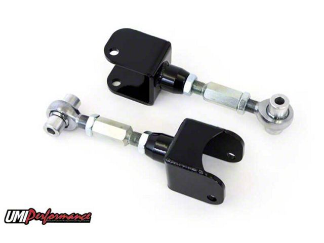 UMI's Ultimate rear upper trailing arms for the Ford Mustang feature on-car adjustability combined with race quality rod ends. These adjustable arms can be used to tune pinion angle and lateral location while being strong enough to handle anything you can throw at them. Laser cut mild steel mounting brackets combined with CrMo adjusters work together to make these the ultimate upper control arm. Installation takes about one hour and is bolt in. Crafted with pride in the USA.