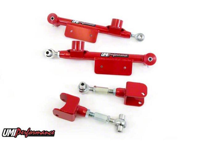 This complete kit includes (1) set of UMI Performance single adjustable lower control arms and (1) set of UMI's "on-car" double adjustable upper control arms. These direct bolt-on replacements are designed to minimize wheel hop, improve cornering while lowering ET's and help track consistency. The upper control arms feature on-car adjustability allowing for quick and easy pinion angle adjustment; its as simple as loosing 2 nuts! The spherical rod end allows for a "bind free" operation, making a great upgrade for both your track and auto cross driven vehicle. The polyurethane bushings are designed to be bolted to the chassis for a quiet comfortable operation. Lower Control arms are constructed DOM mild steel tubing 1.500" OD x 0.120" wall, 4130 chromoly threaded tube adaptor, completely CNC machined and fully TIG welded for outstanding strength. The upper control arms feature 0.250" mild steel mounting points, 4130 chromoly tube adaptor and 4140 chromoly heat treated 1.120" solid adjuster; truly overkill. Control arms feature Energy Suspension polyurethane bushings, zinc plated steel sleeves and "on-car" grease able zerk grease fittings. Adjustments can be made using the high quality QA1 Teflon lined spherical rod end's that operate for a quiet bind free performance. Our lower control arms feature reinforced spring perches and heavy duty sway bar mounting points.