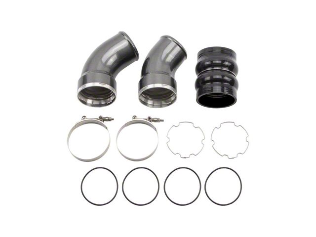 The 3.5" High Flow Passenger (Cold) Side Intercooler Pipe Kit for 2006-2010 LBZ/LMM Duramax replaces the failure prone factory plastic piece with a larger, high flow, 14 ga. aluminum fabricated 3.5" pipe. This part uses CNC machined flanges with double o-ring seals, comes supplied with a new wire clip rings for both slip flanges, and uses an upgraded silicone hump boot with stainless steel t-bolt clamps to withstand higher boost pressures than the factory components to increase reliability and eliminate blown factory boots and horsepower robbing boost leaks. Finished in your choice of custom powder colors. This pipe is compatible with stock trucks requiring no additional modifications, upgrades, or tuning for installation. Improves airflow between the turbo and engine for improved efficiency, throttle response, and turbo spool up. Eliminates weak points in the factory design that can lead to boost leaks or complete failures in hard working and high performance applications. Installs easily with basic hand tools. Pairs best with emissions compliant tuning and drop in turbochargers for optimum performance gains.