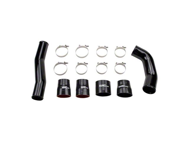 Stage 1 High Flow Bundle Kit for 2010-2012 6.7 Cummins improves airflow between the turbo and engine for improved efficiency, throttle response, and turbo spool up. Eliminates weak points in the factory design that can lead to boost leaks or complete failures in hard working and high performance applications. Replaces the poorly flowing, small diameter, crushed, factory pipes with our heavy duty, high flowing 3" Diameter Hot Side and 3.5" Diameter Cold Side Pipes. Kit includes upgraded high quality silicone boots that withstand higher pressure and temperatures than the factory boots to increase reliability and eliminate blown factory boots. Made in the USA from high strength, heavy duty 14 ga. aluminum tube with smooth, aerodynamic mandrel bends for increased durability and optimized flow. Full assembly finished in your choice of WCFab's signature custom powder coat colors for a look as unique as your truck. Installs with basic hand tools. Compatible with stock trucks, no tuning required. Not compatible with Banks Intercoolers