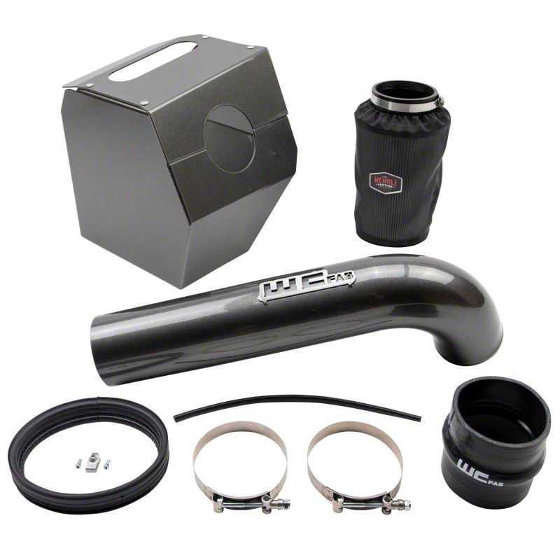 WCFab 2017-2019 GM L5P 6.6L Duramax 4" Intake Kit with Air Box. This high flow, fabricated aluminum intake pipe and air box enclosure with dry filter assembly replaces the restrictive plastic factory parts on your diesel for improved engine performance. All new design significantly increases air flow to your turbo producing improved horsepower and torque, quicker throttle response, and cooler intake temperatures by drawing cold air through the hood Ram Air duct and inner fender. All aluminum construction features large diameter 4" piping with smooth aerodynamic bends to improve intake air velocity, volume, and provide more aggressive engine and turbo sound during acceleration. High quality hardware, silicone boot, seals, and stainless steel t-bolt clamps ensure optimum durability and ease of installation. Removable air box lid element allows for easy visual inspection and maintenance of your WCFab filter with included hydrophobic pre-filter cover, to help keep your MAF sensor, turbo, and engine airways contaminant free. The critical ram air duct seal has been moved to the bottom of the hood for a clean engine compartment appearance. Full assembly finished in your choice of WCFab's signature custom powder coat colors for a look as unique as your truck.