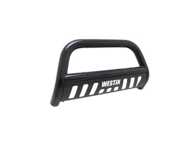 Westins E-Series Bull Bar is a front-end light bar designed for trucks and larger model SUVs. It mounts to the vehicles existing mounting points with no drilling required and comes complete with vehicle specific mount kit. It also features mounting points for 2 auxiliary lights up to 6 inches in diameter. The E-Series Bull Bar features a laser cut Westin block letter logo design on the skid plate. Available in black powder coated e-coated steel with a textured black skid plate backed by a 3 year warranty. Optional license plate bracket is available.