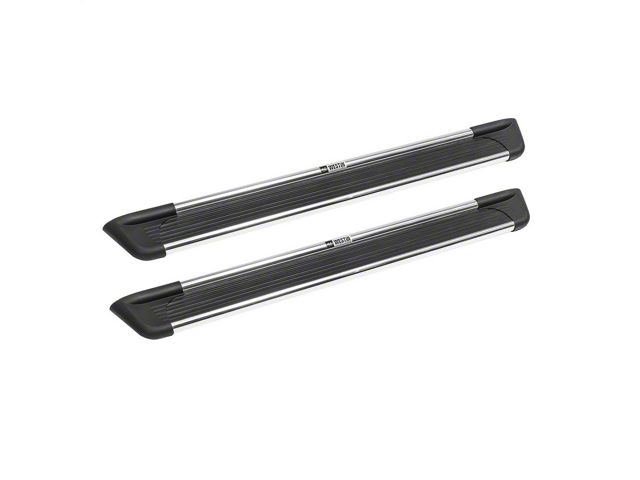 Extruded aluminum. Slip resistant rubber step area. Molded end caps add unique style. Cradle mounted boards. 5 year warranty.