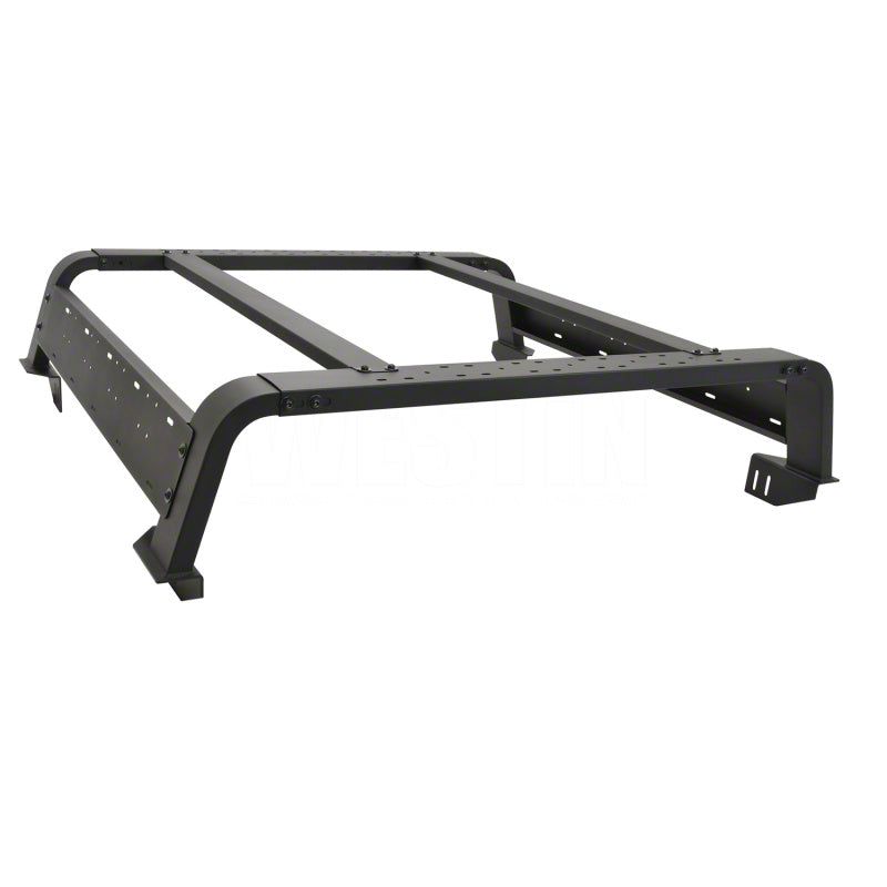 Maximize the cargo space and storage capacity of your truck with an all new Overland Cargo Rack from Westin. This multi-purpose bed rack "cargo management system" allows for a wide variety of off-road and overland gear storage, such as off-road jacks, RotoPaxTM gas cans, traction boards, shovels, rooftop tents, LED lighting and storage boxes, with multiple mounting positions and options. Constructed of 4" rectangular tubing and 14 gauge steel, this unique design utilizes the OEM bed rails for a no-drill mounting which is incredibly strong, but lightweight and easy to install. The low profile design was engineered to keep the cargo gear below the cab roofline, positioning most roof top tents to be flush with the top of the cab roof to reduce wind resistance and allow for easier garage parking. You can choose your preferred rack length (available in either 45" or 57" options), and top support rails which can be mounted in multiple positions as needed. It can also accommodate a wide variety of roof top tent footprints, making the Overland Cargo Rack perfect for any back country adventure.