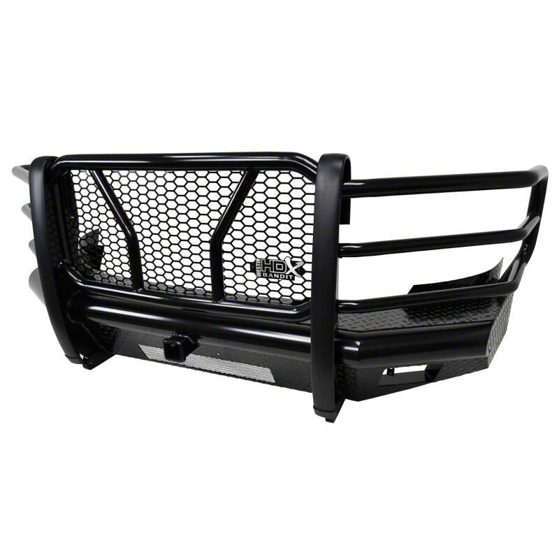 Westins HDX Bandit Bumper combines a heavy duty diamond plate steel bumper constructed of schedule 40 steel pipe with a stylish grille guard featuring 2 in. diameter outer wraparound wings and 2 3/4 in. wide upright rubber strips. Designed to protect headlights, grille, hood and front fenders from road hazards, debris and wildlife damage. Features a stylish metal honeycomb mesh screen, which allows maximum airflow to the intercooler or radiator area while accenting the front end styling with a clean and rugged look. Removable mesh screens allow for factory camera and adaptive cruise control options available on some late model Ford applications. HDX Bandit Bumper includes a built-in 2 in. receiver hitch and (2) heavy duty 9,500 lbs bow shackle mounts, capable of delivering multiple towing options. Compatible for factory fog lamps or LED post mount lights. In addition, some late model Ram and Chevrolet applications feature provisions for factory parking sensors. Bolt-on installation with hardware and mounting brackets included. Available in black powder coat finish.