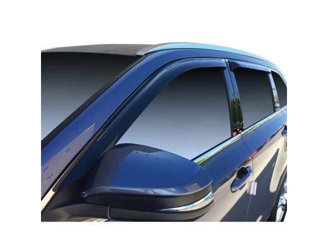Tape On Wind Deflectors are a quick and quality solution to reducing wind, noise, heat, and glare without compromising the entry of fresh air when windows are rolled down slightly. They attach easily into position with 3M automotive grade tape on to the vehicle's outer window frame. Wind deflectors promote the circulation of fresh air while minimizing its volume and strength as it re-directs it up and into, or out of the vehicle. Their sleek design deflects wind and noise from entering the vehicle for a more pleasant ride any time of year. They are made from high-gloss smoke acrylic, and have transparency, so, visibility is never obstructed.