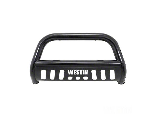 Westins E-Series Bull Bar is a front-end light bar designed for trucks and larger model SUVs. It mounts to the vehicles existing mounting points with no drilling required and comes complete with vehicle specific mount kit. It also features mounting points for 2 auxiliary lights up to 6 inches in diameter. The E-Series Bull Bar features a laser cut Westin block letter logo design on the skid plate. Available in black powder coated e-coated steel with a textured black skid plate backed by a 3 year warranty. Optional license plate bracket is available.