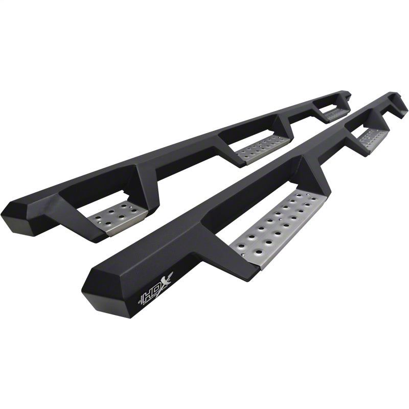 Westin's HDX Stainless Drop W2W Nerf Step Bars are built with corrosion-resistant, textured black painted stainless steel designed to last under the toughest of conditions. Built with 1-piece construction, these Nerf Step Bars feature a notched bar design with a 3rd step location for easy bed access and provide over 2 more inches of toe/heel step area than our competitors. The longer length of our HDX Stainless Drop WTW Nerf Step Bars provides added vehicle accessability, with the bar still fitting tight to your vehicle's rocker panel for a solid fit and rugged look. Product includes a set of installed stainless steel step pads as well as a set of black mild steel step pads so you can switch plates out based on preference. Step plates are rust resistant and provide maximum traction. Bolt-on installation so no drilling is required. Includes Mount Kit. Westin's exclusive Isolator Bracket supports the step bar past the truck cab, a feature that competitors do not offer. Without an Isolator Bracket, the step area that extends past the vehicle is left unsupported. Our unique design provides extra bed support without resulting in annoying creaking sounds.