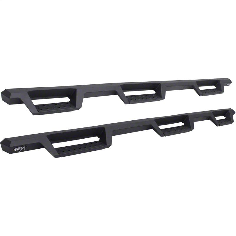 Westins HDX Drop Wheel-to-Wheel Nerf Step Bars feature a notched bar design with a 3rd step location for easy bed access. They provide strong traction with over 2 inches more of toe/heel step area than our Westin's HDX Drop W2W Nerf Step Bars include an added 3rd step location for easier bed area and cargo access. HDX also boasts more than 2 inches of added toe/heel step area which far exceeds all other competitive brands. HDX's notched bar design construction results in a reliable long lasting Bar, with a solid fit and a rugged look. The added length of HDX Drop Wheel-to-wheel Nerf Step Bars provides users with better cab access and better footing and traction for both drivers and passengers. Product includes mount kit and is offered in a variety of vehicle specific applications. Bolt-on installation so no drilling required. Mount kit included. Westin's exclusive Isolator Bracket supports the step bar past the truck cab, a feature that competitors do not offer. Without an Isolator Bracket, the step area that extends past the vehicle is left unsupported. Our unique design provides extra bed support without resulting in annoying creaking sounds.