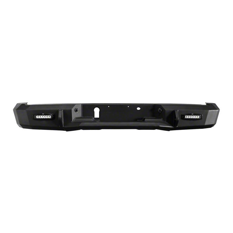 HDX Rear Bumpers are a solid one-piece construction made of 7 gauge steel. Application specific designs feature seamless welded bends and a textured black finish. Also available raw. Includes two FM6 LED Flush Mounts. Available with or without rear back-up sensors. HDX Rear Bumpers are designed engineered tested and manufactured in the USA.