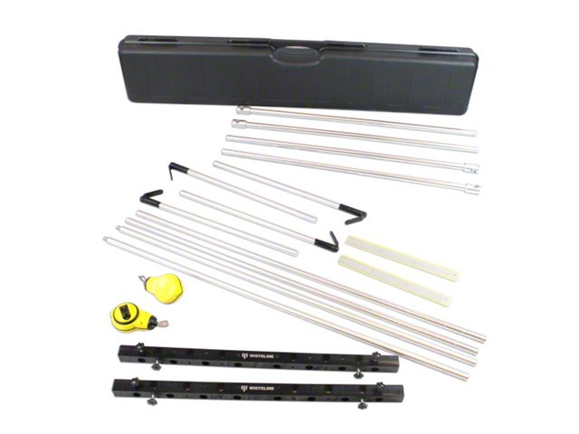 Everything needed to perform an at the track or in the garage wheel alignment including retractable string lines and rulers for measuring. Comes in a hard plastic carry case for ease of transportation and storage.