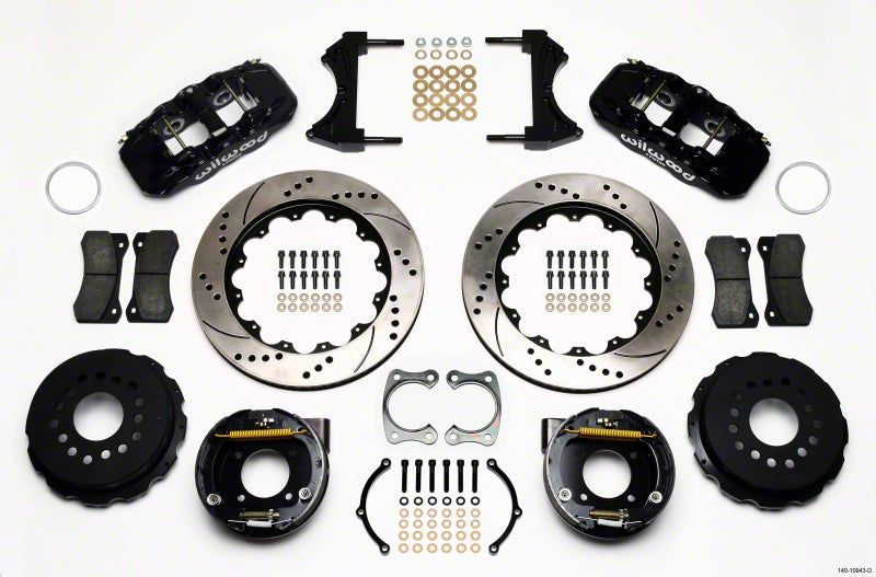 AERO4 Rear Parking Brake kits provide the ultimate Big Brake solution for popular muscle car rear axles that require a parking brake. Forged AERO4 four piston calipers, 14" two-piece rotors, and high performance BP-10 compound pads provide optimized and balanced braking to compliment front big brake upgrades on all types of custom, show and high performance street machines. The neatly hidden internal shoe system provides a clean installation with superior static holding power for parking. Optional caliper finishes and rotor designs allow builders to personalize the style and performance for every application.