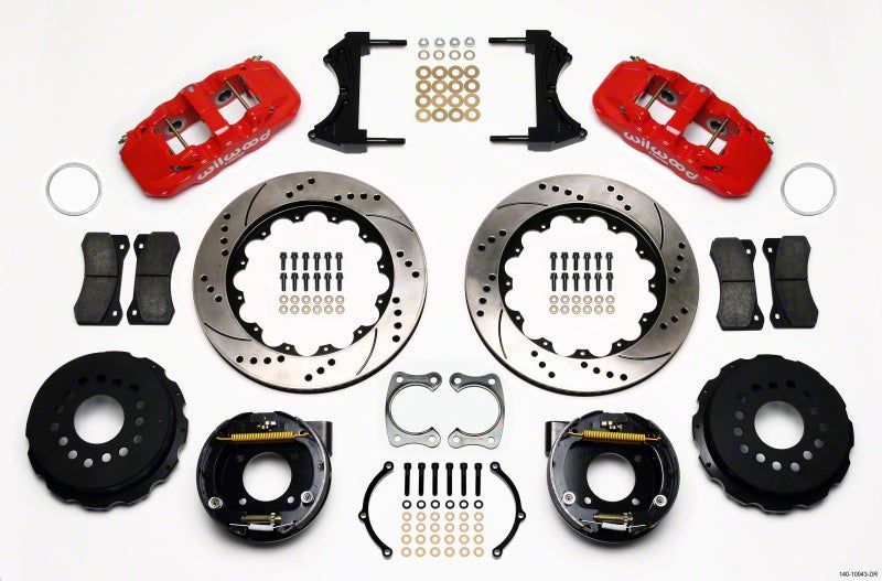 AERO4 Rear Parking Brake kits provide the ultimate Big Brake solution for popular muscle car rear axles that require a parking brake. Forged AERO4 four piston calipers, 14" two-piece rotors, and high performance BP-10 compound pads provide optimized and balanced braking to compliment front big brake upgrades on all types of custom, show and high performance street machines. The neatly hidden internal shoe system provides a clean installation with superior static holding power for parking. Optional caliper finishes and rotor designs allow builders to personalize the style and performance for every application.
