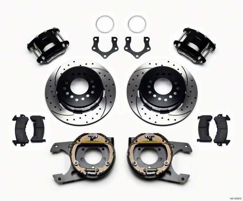 D154 Pro-Series rear disc kits provides a complete solution for popular muscle car rear axles that require a parking brake. Forged D154 dual piston calipers, 12.19" one-piece drum/rotors, and high friction pads provide optimized and balanced braking for all types of custom performance street/strip and show machines. The neatly hidden internal shoe system provides a clean installation with superior static holding power for parking. D154 rear caliper kits offer a complimentary match to vehicles using Wilwood D52 or D154 calipers on OE spindles. Optional caliper finishes and rotor designs enable the builder to personalize the style and optimize brake performance.
