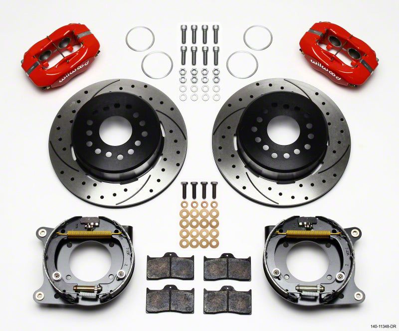 This group of FDL Pro-Series rear disc kits provides a complete solution for popular muscle car rear axles that require a parking brake. Forged billet Dynalite four piston calipers, 12.19†one-piece drum/rotors, and high friction pads provide optimized and balanced braking for all types of custom performance street/strip and show machines. The neatly hidden internal shoe system provides a clean installation with superior static holding power for parking. Optional caliper finishes and rotor designs enable the builder to personalize the style and optimize brake performance for every individual application.