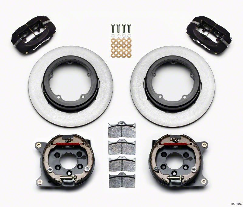 This group of FDL Pro-Series rear disc kits provides a complete solution for popular muscle car rear axles that require a parking brake. Forged billet Dynalite four piston calipers, 12.19" one-piece drum/rotors, and high friction pads provide optimized and balanced braking for all types of custom performance street/strip and show machines. The neatly hidden internal shoe system provides a clean installation with superior static holding power for parking. Optional caliper finishes and rotor designs enable the builder to personalize the style and optimize brake performance for every individual application.