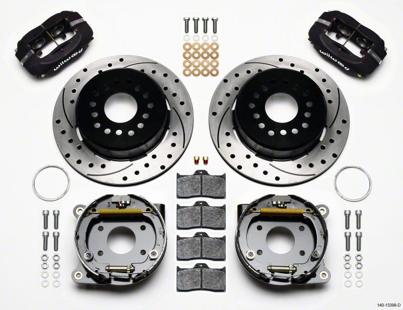 This group of FDL Pro-Series rear disc kits provides a complete solution for popular muscle car rear axles that require a parking brake. Forged billet Dynalite four piston calipers, 12.19" one-piece drum/rotors, and high friction pads provide optimized and balanced braking for all types of custom performance street/strip and show machines. The neatly hidden internal shoe system provides a clean installation with superior static holding power for parking. Optional caliper finishes and rotor designs enable the builder to personalize the style and optimize brake performance for every individual application.