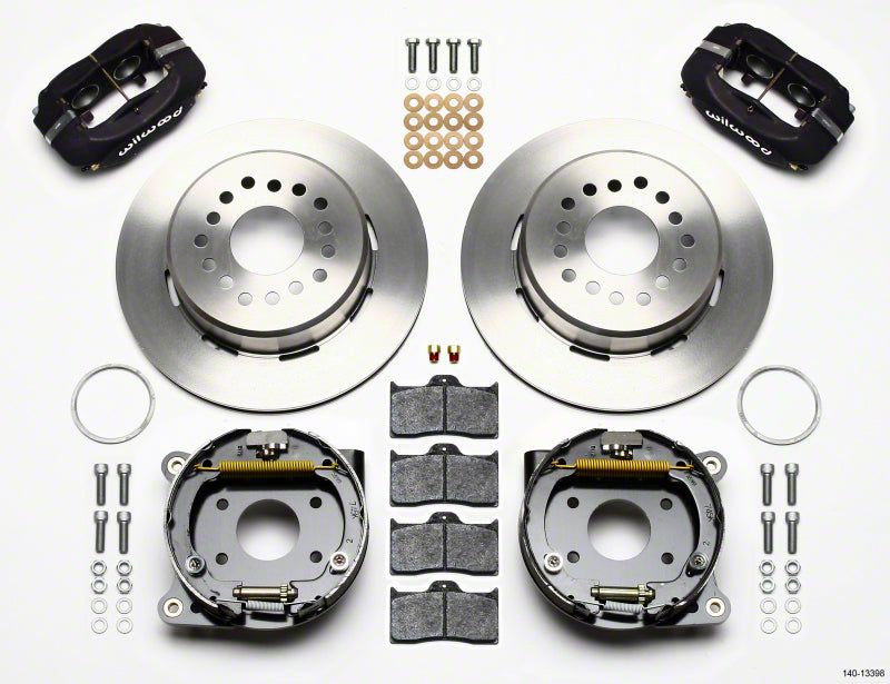 This group of FDL Pro-Series rear disc kits provides a complete solution for popular muscle car rear axles that require a parking brake. Forged billet Dynalite four piston calipers, 12.19" one-piece drum/rotors, and high friction pads provide optimized and balanced braking for all types of custom performance street/strip and show machines. The neatly hidden internal shoe system provides a clean installation with superior static holding power for parking. Optional caliper finishes and rotor designs enable the builder to personalize the style and optimize brake performance for every individual application.