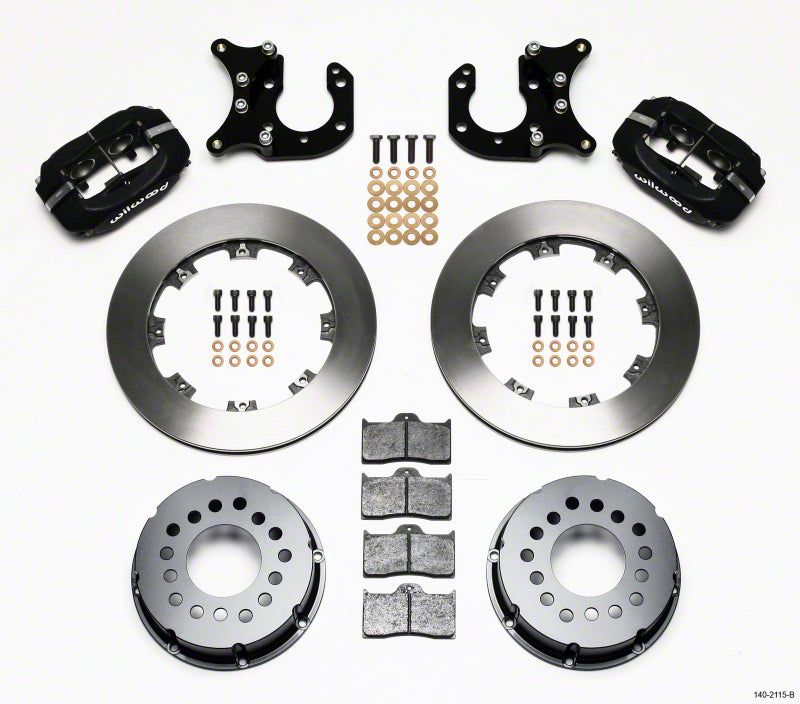 FDL Pro-Series rear disc brake kits provide a complete solution for popular muscle car rear axles on applications where individual wheel parking brake assemblies are not required. Forged billet Dynalite four piston calipers, two-piece hat and rotor assemblies, and high friction pads provide optimized and balanced braking for all types of off-road, competition, and other customized applications. FDL calipers can be optioned with a full range of finishes to reflect personalized style. Rotor choices provide options for high-tech show winning style, or heavy weight durability and cooling capacity for high heat competition.