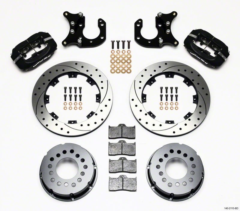 FDL Pro-Series rear disc brake kits provide a complete solution for popular muscle car rear axles on applications where individual wheel parking brake assemblies are not required. Forged billet Dynalite four piston calipers, two-piece hat and rotor assemblies, and high friction pads provide optimized and balanced braking for all types of off-road, competition, and other customized applications. FDL calipers can be optioned with a full range of finishes to reflect personalized style. Rotor choices provide options for high-tech show winning style, or heavy weight durability and cooling capacity for high heat competition.