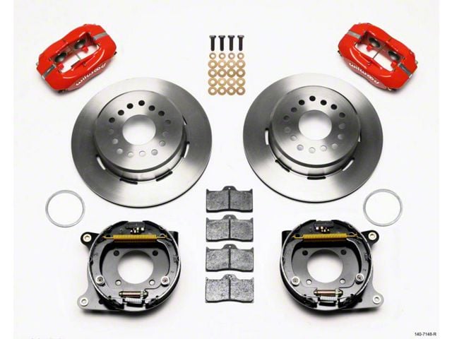 This group of FDL Pro-Series rear disc kits provides a complete solution for popular muscle car rear axles that require a parking brake. Forged billet Dynalite four piston calipers, 12.19" one-piece drum/rotors, and high friction pads provide optimized and balanced braking for all types of custom performance street/strip and show machines. The neatly hidden internal shoe system provides a clean installation with superior static holding power for parking. Optional caliper finishes and rotor designs enable the builder to personalize the style and optimize brake performance for every individual application.