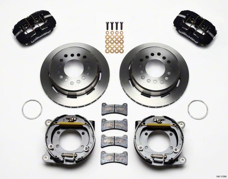 Forged Dynapro Low-Profile Pro-Series rear disc brake kits provide a complete solution for popular muscle car rear axles on applications that require a parking brake assembly and extra clearance for 14.00" to 15.00" rim applications. Forged billet Dynapro Low-Profile four-piston calipers 11.00" one-piece hat and rotor assemblies, and high friction pads provide optimized and balanced braking for all types of custom performance street/strip and show machines. The neatly hidden internal shoe system provides a clean installation with superior static holding power for parking. Optional caliper finishes and rotor designs enable the builder to personalize the style and optimize brake performance for every individual application.