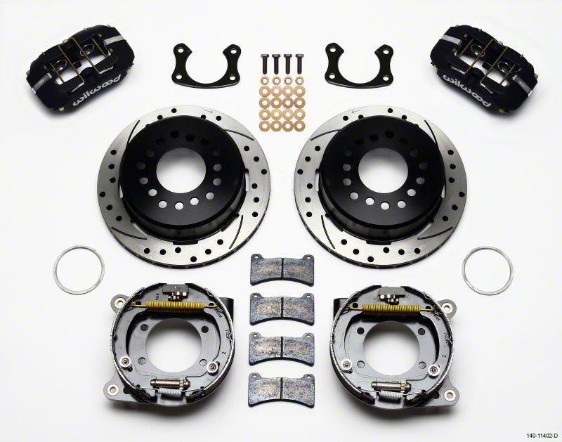 Forged Dynapro Low-Profile Pro-Series rear disc brake kits provide a complete solution for popular muscle car rear axles on applications that require a parking brake assembly and extra clearance for 14.00" to 15.00" rim applications. Forged billet Dynapro Low-Profile four-piston calipers 11.00" one-piece hat and rotor assemblies, and high friction pads provide optimized and balanced braking for all types of custom performance street/strip and show machines. The neatly hidden internal shoe system provides a clean installation with superior static holding power for parking. Optional caliper finishes and rotor designs enable the builder to personalize the style and optimize brake performance for every individual application.