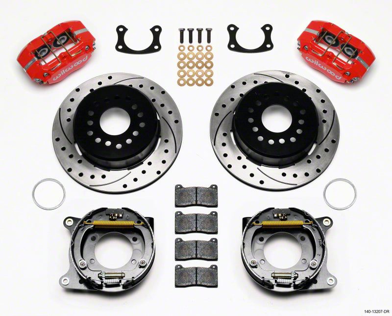 DP-DB Pro-Series rear disc kits provide a complete solution for popular muscle car rear axles that require a parking brake. Forged billet Dynapro Dust Boot calipers, 12.19" one-piece drum/rotors, and high friction pads provide optimized and balanced braking for all types of custom performance street/strip and show machines. These kits were developed for applications or locations that require or prefer a dust-booted piston. Dust-booted aluminum pistons provide added protection against road or track born dirt and debris on low to intermediate temperature range applications that may also operate in harsh environments. The neatly hidden internal shoe system provides a clean installation with superior static holding power for parking. Optional caliper finishes and rotor designs enable the builder to personalize the style and optimize brake performance for every individual application.