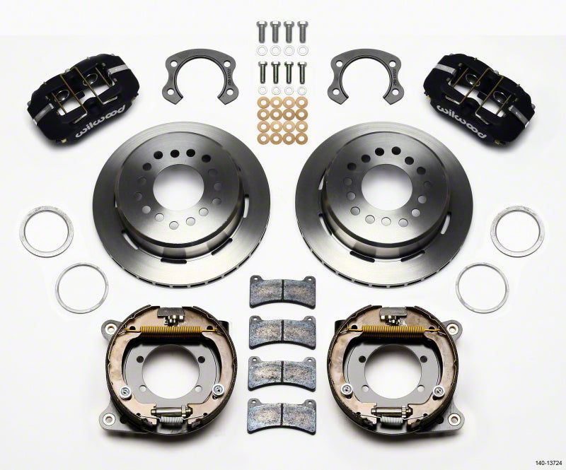 Forged Dynapro Low-Profile Pro-Series rear disc brake kits provide a complete solution for popular muscle car rear axles on applications that require a parking brake assembly and extra clearance for 14.00" to 15.00" rim applications. Forged billet Dynapro Low-Profile four-piston calipers 11.00" one-piece hat and rotor assemblies, and high friction pads provide optimized and balanced braking for all types of custom performance street/strip and show machines. The neatly hidden internal shoe system provides a clean installation with superior static holding power for parking. Optional caliper finishes and rotor designs enable the builder to personalize the style and optimize brake performance for every individual application.