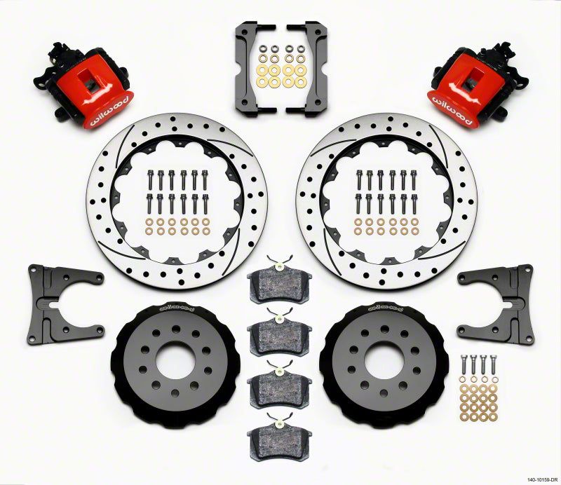 Combination hydro-mechanical Parking Brake calipers use hydraulic pressure from the master cylinder for stopping power, and an internal mechanical lock within the caliper for a parking brake. CPB kits are built primarily for front wheel drive vehicles, and select rear wheel drive axles that are not well suited for internal shoe style parking brakes. The calipers are coupled with oversized two-piece rotor assemblies with aluminum hats and high friction BP-10 compound pads. CPB kits provide the correct balanced brake performance and matching style to compliment front big brake upgrade kits.
