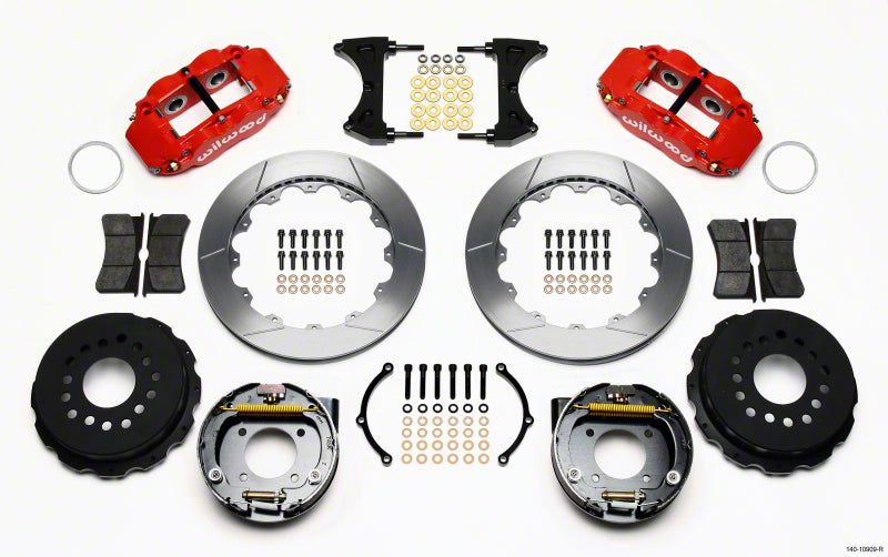 Forged Narrow Superlite 4R rear disc kits provide the ultimate Big Brake solution for popular muscle car rear axles that require a parking brake. FNSL4R four piston calipers, 13" or 14" two-piece rotors, and high performance BP-10 compound pads provide optimized and balanced braking to compliment front big brake upgrades on all types of custom, show and high performance street machines. The neatly hidden internal shoe system provides a clean installation with superior static holding power for parking. Optional caliper finishes and rotor designs allow builders to personalize the style and performance for every application.
