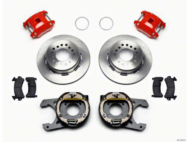 D154 Pro-Series rear disc kits provides a complete solution for popular muscle car rear axles that require a parking brake. Forged D154 dual piston calipers, 12.19" one-piece drum/rotors, and high friction pads provide optimized and balanced braking for all types of custom performance street/strip and show machines. The neatly hidden internal shoe system provides a clean installation with superior static holding power for parking. D154 rear caliper kits offer a complimentary match to vehicles using Wilwood D52 or D154 calipers on OE spindles. Optional caliper finishes and rotor designs enable the builder to personalize the style and optimize brake performance.
